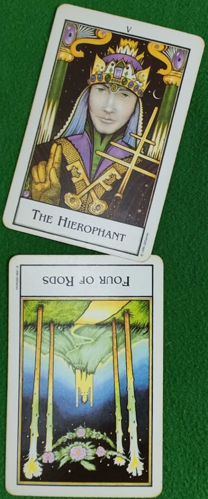 “ 杖の4は遠くの城に道が続いていますが、逆位置(さかさま)です。